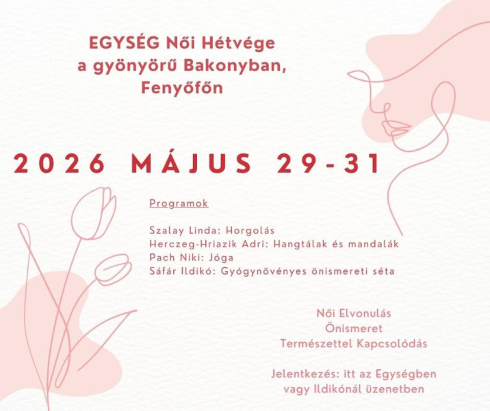 Átszervezés és némi csere-bere után sikerült új időpontot találni, így megrendezésre kerül az Egység Női Hétvége: 2026.05.29-30-31. dátummal! Amire hatalmas szeretettel várunk Minden Kedves Hölgyet!